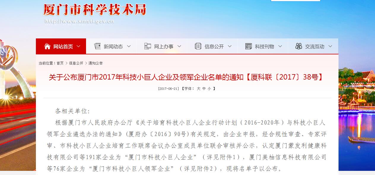 近日,厦门市科学技术局公布2017年“科技小巨人领军企业”名单。厦门朗视信息科技有限公司成功入围,获得殊荣。